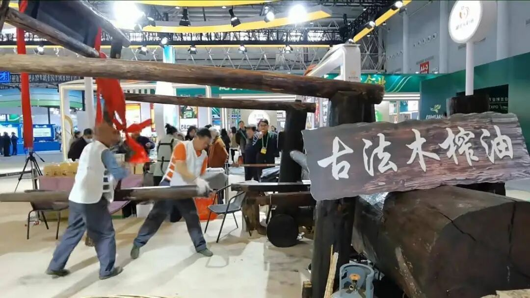 循着浓浓的茶油香和木头的撞击声,记者来到一个“古法木榨油”现场,这里围满观展的大人与小孩。